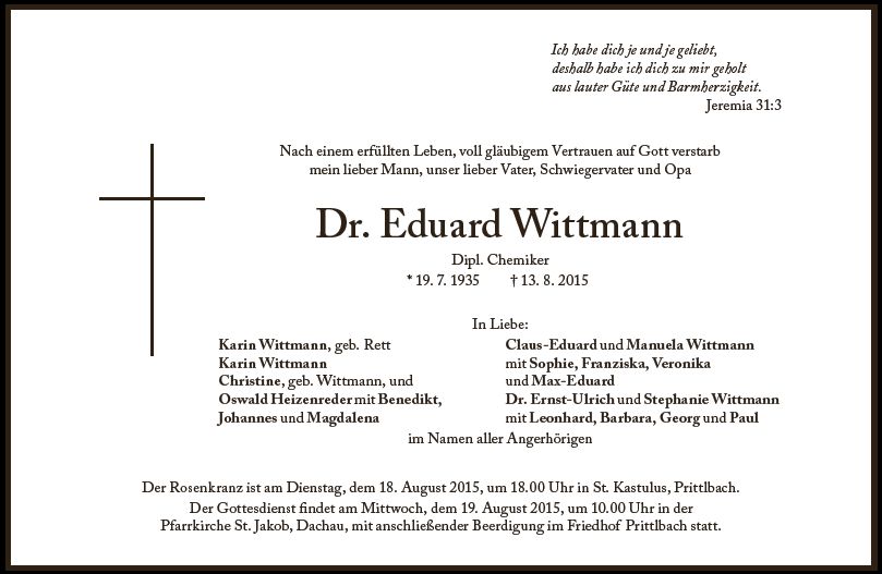 Wir trauern um Herrn Dr. Eduard Wittmann Dipl. Chemiker * 19.07.1935 † 13.08.2015 |