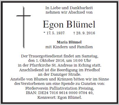 Gottesdienst am Samstag, dem 1. Oktober 2016, um 10:00 Uhr in St. Andreas - Neu in Eching Anschließend Beerdigung im Friedhof an der Danziger Straße