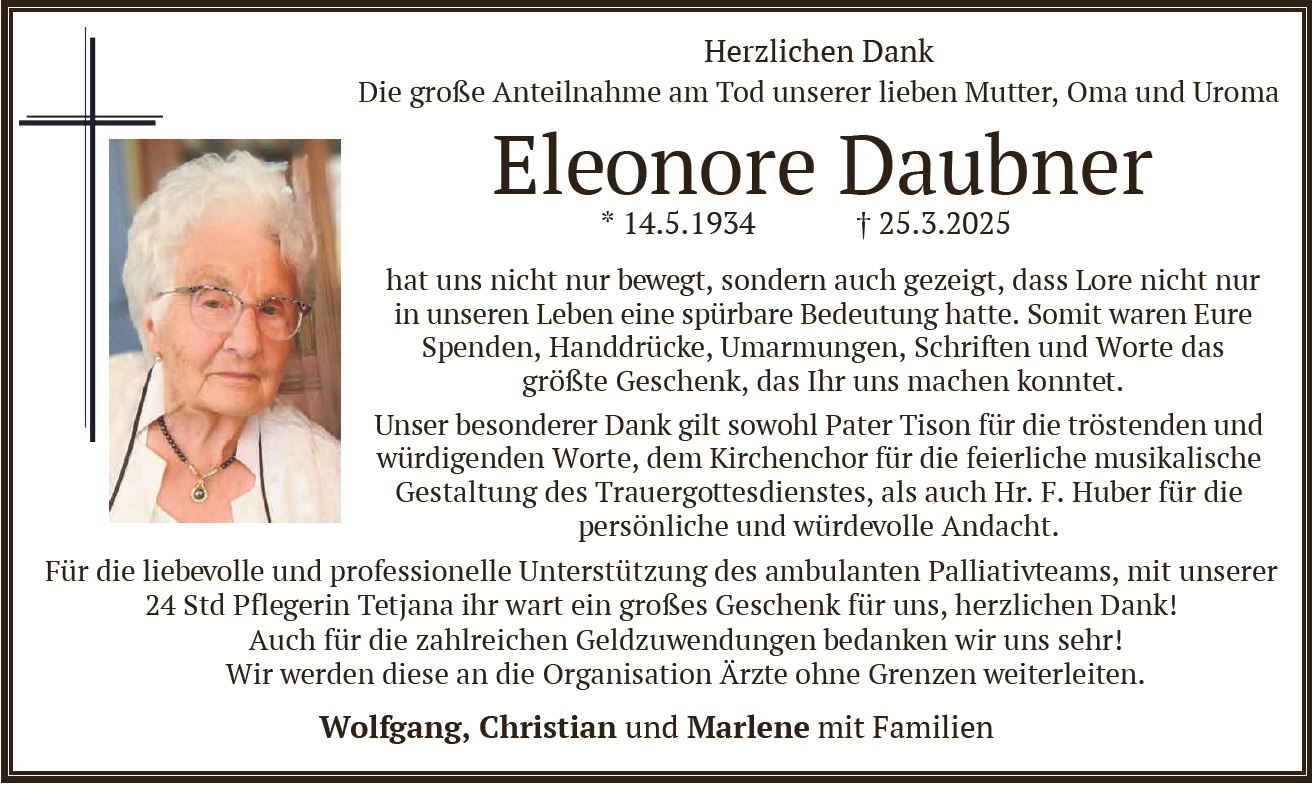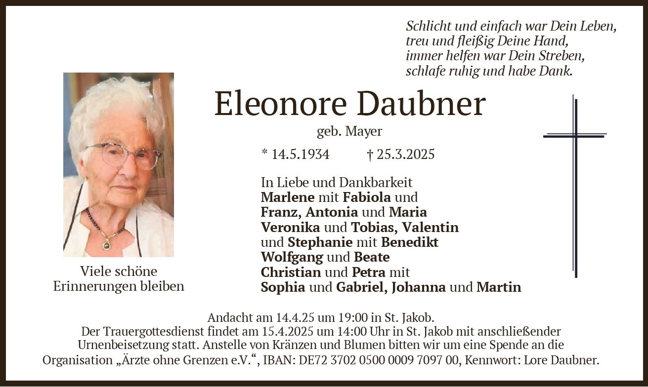 Wir trauern um Frau Eleonore Daubner geb. Mayer * 14.05.1934 † 25.03.2025 |