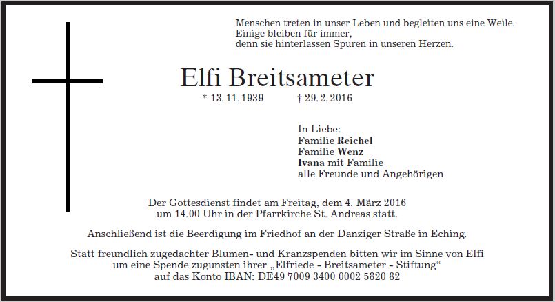 Gottesdienst am Freitag, dem 4. März 2016, um 14:00 Uhr in St. Andreas - Neu in Eching Anschließend Beerdigung im Friedhof Eching an der Danziger Straße