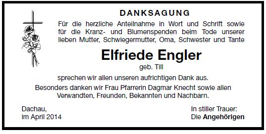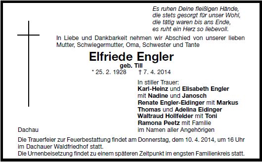Trauerfeier am Donnerstag, dem 10. April 2014, um 16:00 Uhr im Dachauer Waldfriedhof.