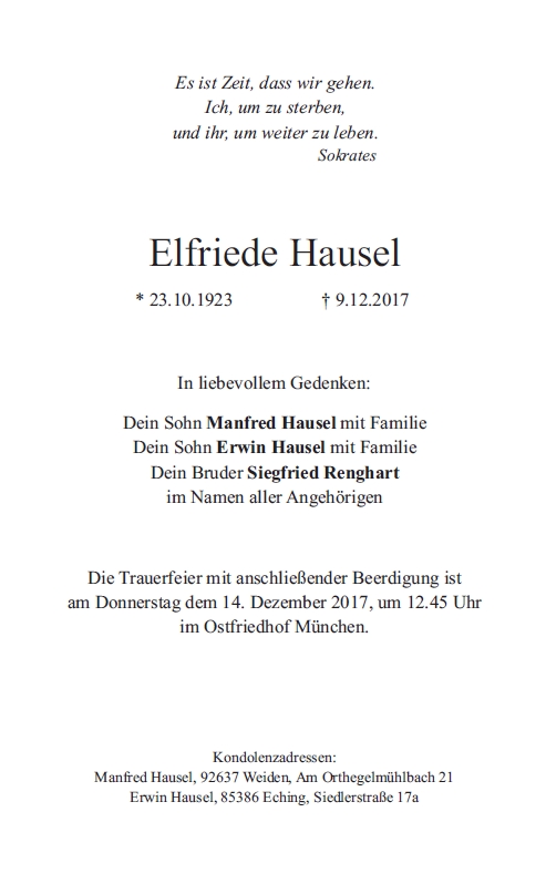 Wir trauern um Frau Elfriede Hausel geb. Renghart Hausfrau * 23.10.1923 † 09.12.2017 |