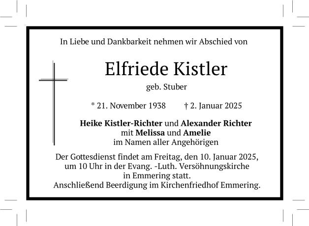 Der Gottesdienst findet am Freitag, den 10. Januar 2025 um 10 Uhr in der Evang. -Luth. Versöhnungskirche in Emmering statt. Anschließend Beerdigung im Kirchenfriedhof Emmering.