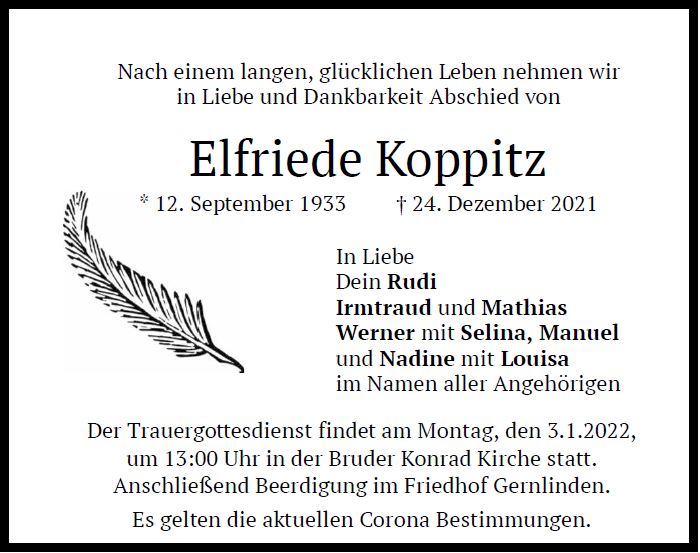 Wir trauern um Frau Elfriede Koppitz * 12.09.1933 † 24.12.2021 |