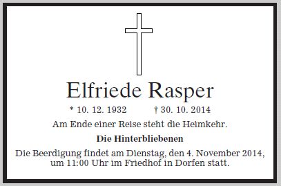 Beerdigung am Dienstag, dem 4. November 2014, um 11:00 Uhr im Friedhof in Dorfen