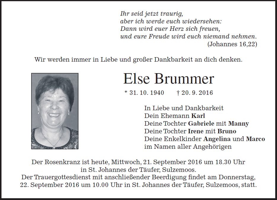 Wir trauern um Frau Elisabeth Brummer geb. Englmann Hausfrau * 31.10.1940 † 20.09.2016 |