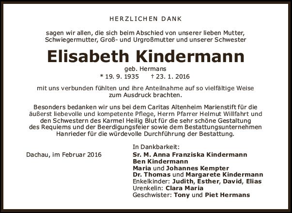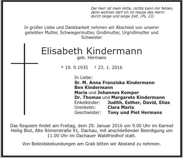 Gottesdienst am Freitag, dem 29. Januar 2016, um 09:00 Uhr im Karmel Heilig Blut, Dachau. Beerdigung am Freitag, dem 29. Januar 2016, um 11:00 Uhr im Dachauer Waldfriedhof.