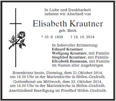 Frau Elisabeth Krautner geb. Merk