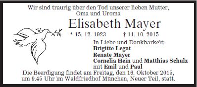 Die Beerdigung findet am Freitag, den 16. Oktober 2015, um 09:45 Uhr im Münchner Waldfriedhof, Neuer Teil, statt. |