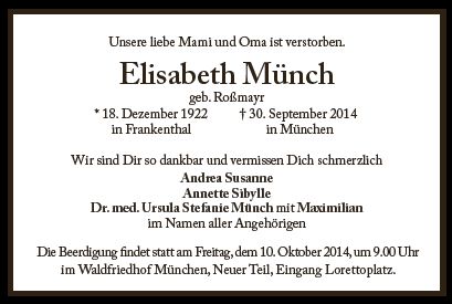 Wir trauern um Frau Elisabeth Münch geb. Roßmayr Studienrätin * 18.12.1922 † 30.09.2014 |