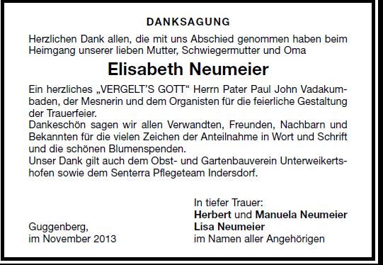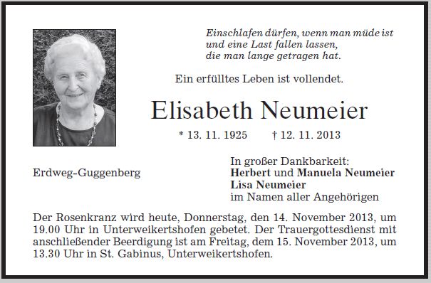 Wir trauern um Frau Elisabeth Neumeier geb. Zinnöcker Hausfrau * 13.11.1925 † 12.11.2013 |