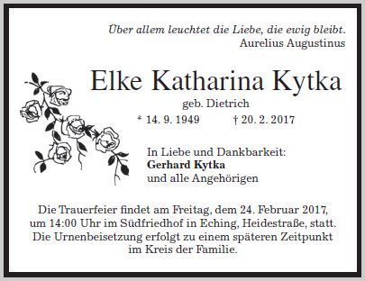 Verabschiedung zur Feuerbestattung am Freitag, dem 24. Februar 2017, um 14:00 Uhr im Echinger Südfriedhof