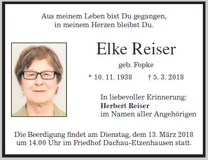 Beerdigung am Dienstag, dem 13. März 2018, um 14:00 Uhr im Friedhof Dachau - Etzenhausen.