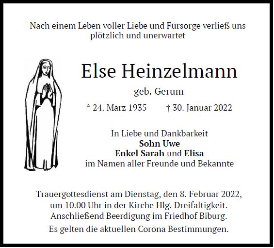 Wir trauern um Frau Else Heinzelmann geb. Gerum * 24.03.1935 † 30.01.2022 |