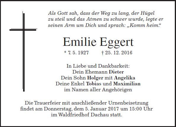 Wir trauern um Frau Emilie Eggert geb. Elbl Hausfrau * 07.05.1927 † 25.12.2016 |