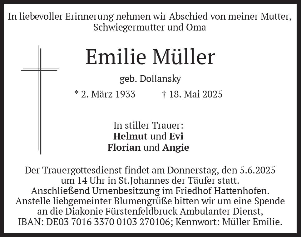 Wir trauern um Frau Emilie Müller geb. Dollansky * 02.03.1933 † 18.05.2025 |