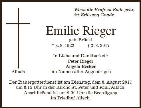 Der Trauergottesdienst ist am Dienstag, dem 8. August 2017, um 8.15 Uhr in der Kirche