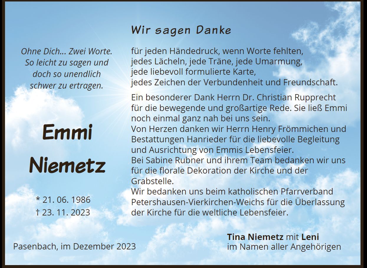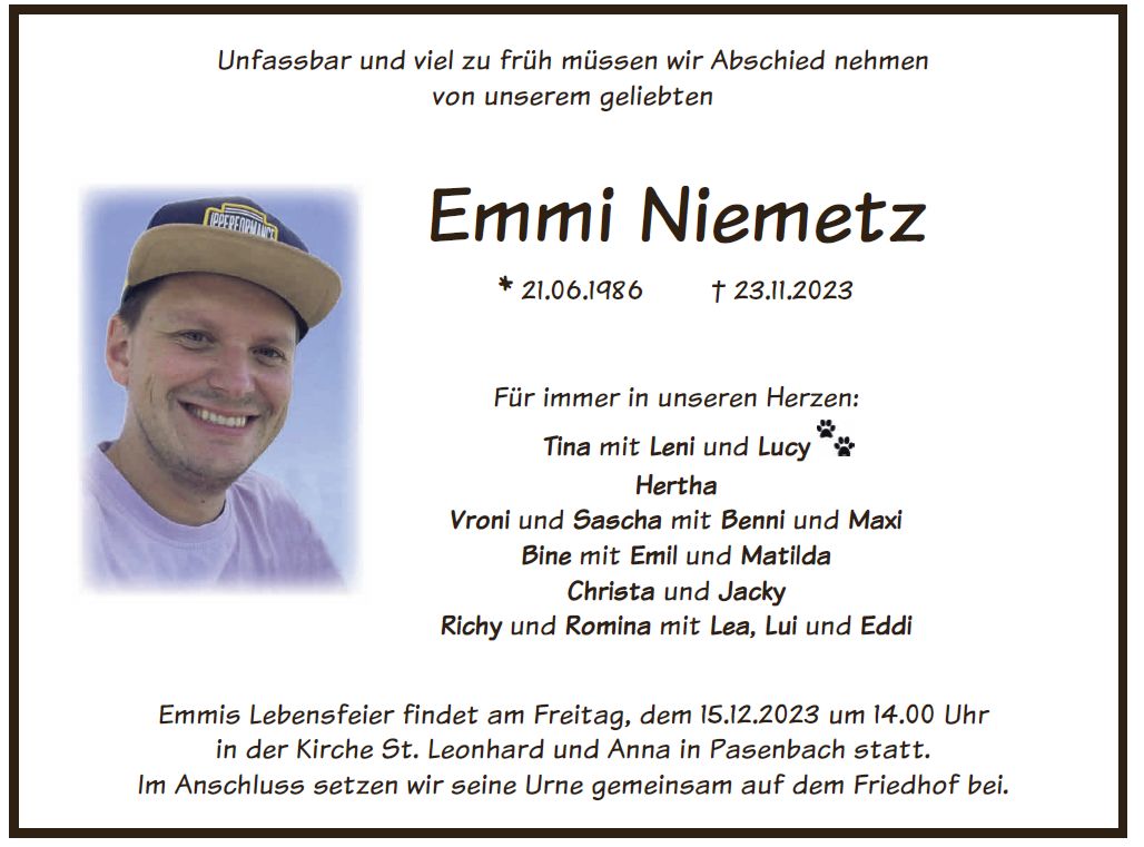 Emmis Lebensfeier findet am Freitag, dem 15.12.2023, um 14.00 Uhr in der Kirche St. Leonhard und Anna in Pasenbach statt. Im Anschluss setzen wir seine Urne gemeinsam auf dem Friedhof in Pasenbach bei.
