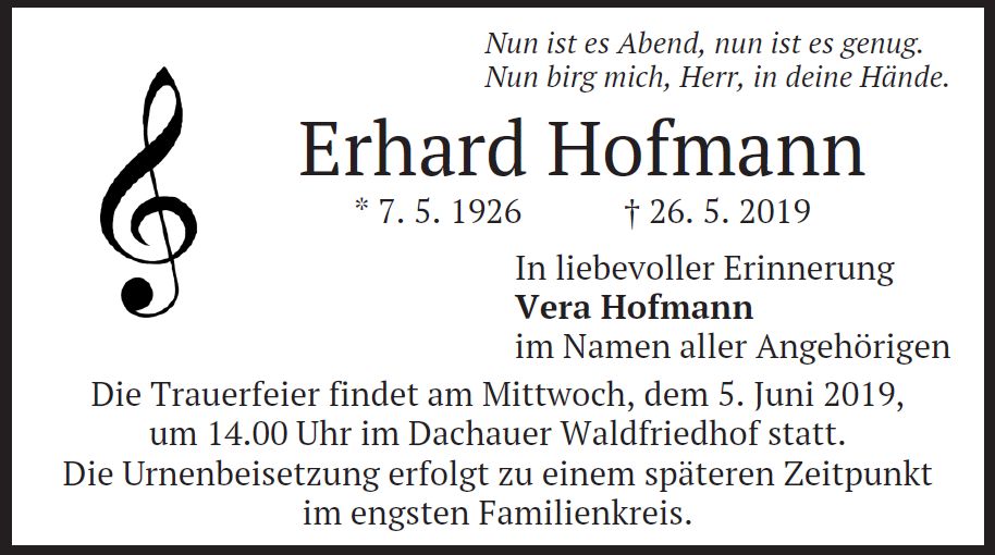 Trauerfeier am 05.06.2019 um 14:00 Uhr im Dachauer Waldfriedhof. Die Urnenbeisetzung findet zu einem späteren Zeitpunkt im engsten Familienkreis statt.