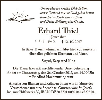Trauerfeier mit anschließender Urnenbeisetzung am 26.10.2017 um 14:00 Uhr im Friedhof Hochmutting
