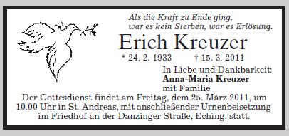 Gottesdienst am Freitag, dem 25.03.2011 um 10.00 Uhr in der Pfarrkirche St. Andreas in Eching Anschließend Urnenbeisetzung im Friedhof in der Danziger Straße
