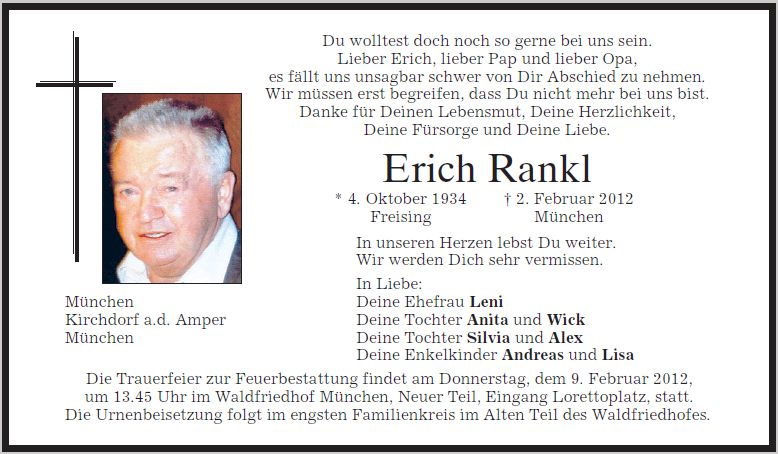 Die Trauerfeier zur Feuerbestattung ist am Donnerstag, dem 9. Februar 2012, um 13:45 Uhr im Münchner Waldfriedhof Neuer Teil. Die Urnenbeisetzung folgt im engsten Familienkreis im Waldfriedhof Alter Teil.