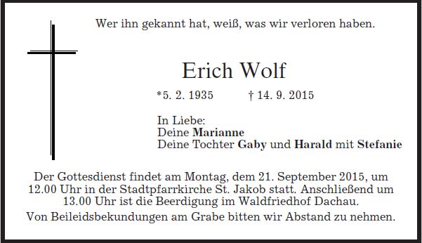 Gottesdienst am Montag, dem 21. September 2015, um 12:00 Uhr in St. Jakob Beerdigung am Montag, dem 21. September 2015, um 13:00 Uhr im Dachauer Waldfriedhof