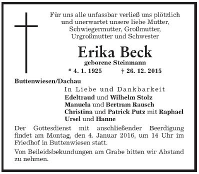 Beerdigung am Montag, dem 4. Januar 2016, um 14:00 im Alten Friedhof in Buttenwiesen