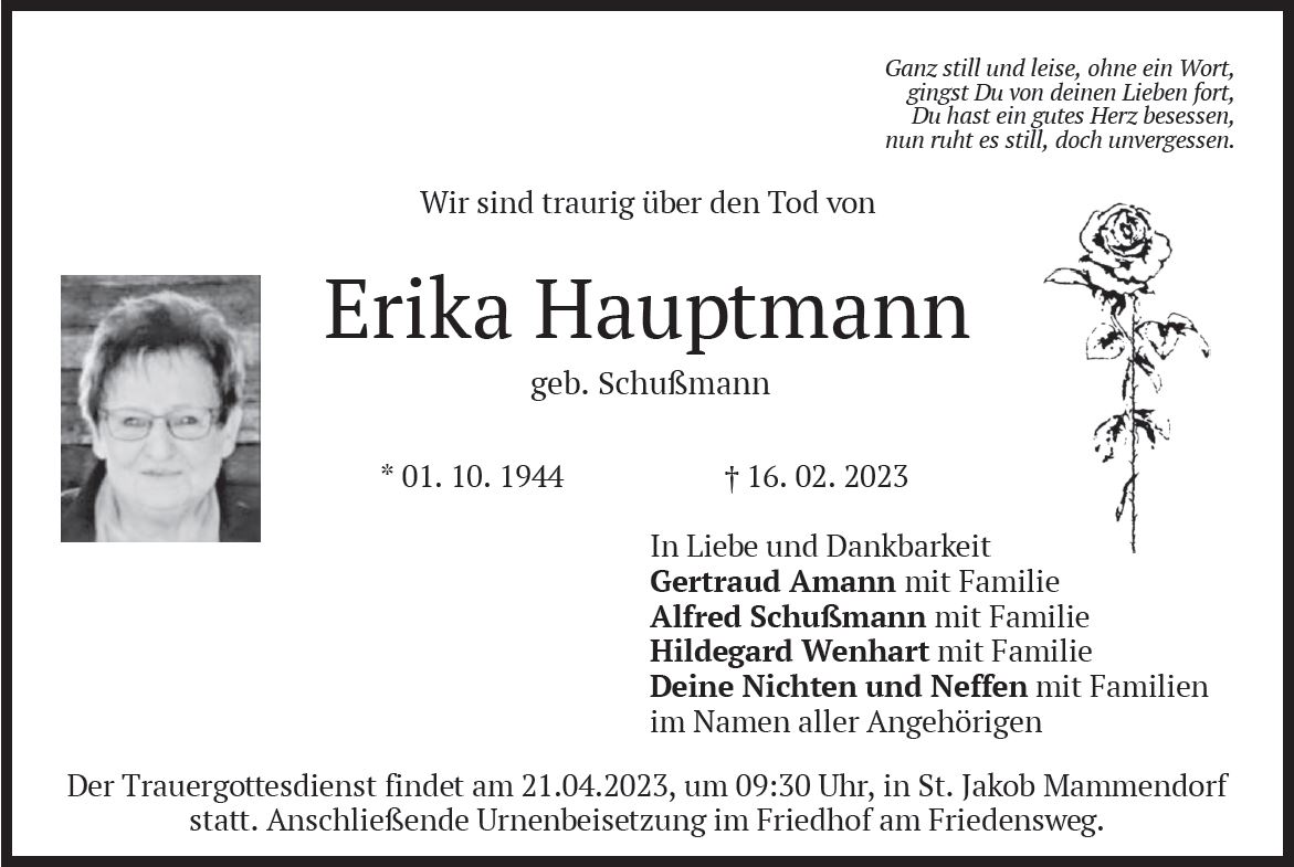 Wir trauern um Frau Erika Hauptmann geb. Schußmann * 01.10.1944 † 16.02.2023 |