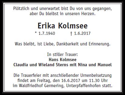 Die Trauerfeier findet am Freitag, dem 16. Juni 2017, um 11:30 Uhr im Waldfriedhof Germering, Unterpfaffenhofen, statt. |