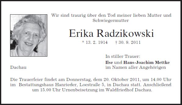 Trauerfeier am Donnerstag, dem 20. Oktober 2011, um 14:00 Uhr im Hanrieder Bestattungshaus Anschließend Urnenbeisetzung im Waldfriedhof Dachau
