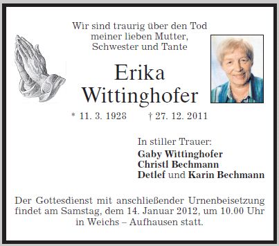 Gottesdienst am Samstag, dem 14. Januar 2012, um 10:00 Uhr in Weichs-Aufhausen Anschließend Urnenbeisetzung in Weichs-Aufhausen