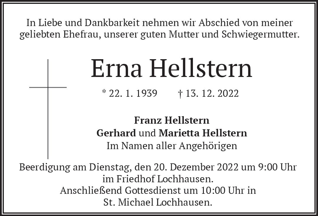Wir trauern um Frau Erna Hellstern geb. Wagner Hausfrau * 22.01.1939 † 13.12.2022 |