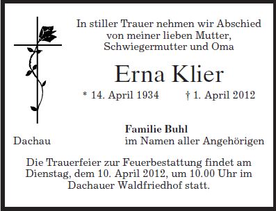Trauerfeier am Dienstag, dem 10. April 2012, um 10:00 Uhr im Dachauer Waldfriedhof.