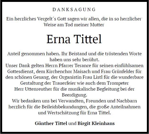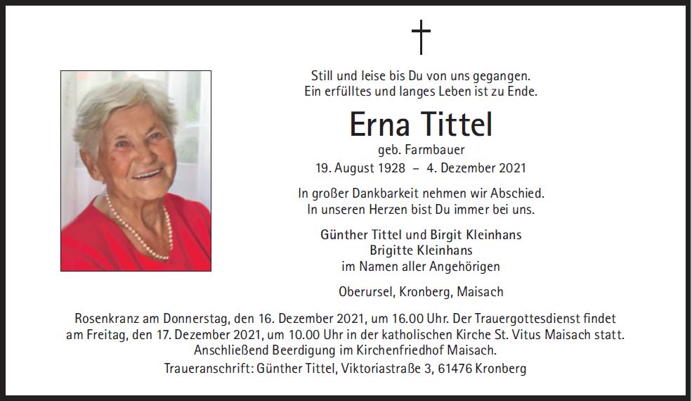 Wir trauern um Frau Erna Tittel geb. Farmbauer * 19.08.1928 † 04.12.2021 |