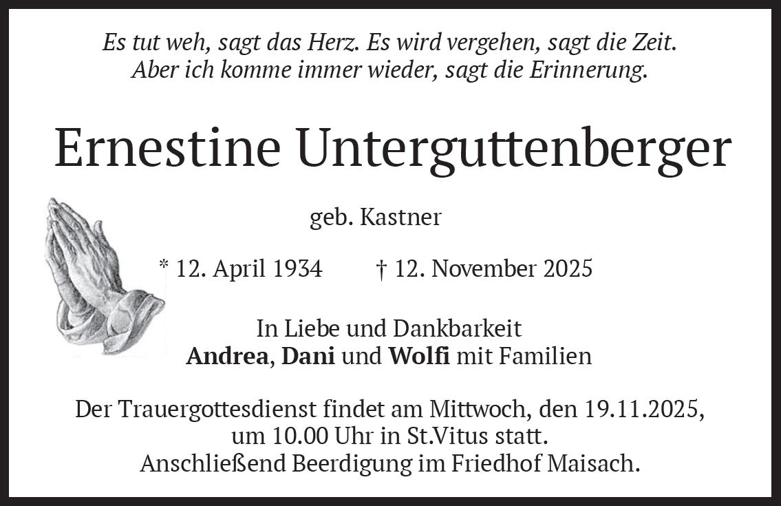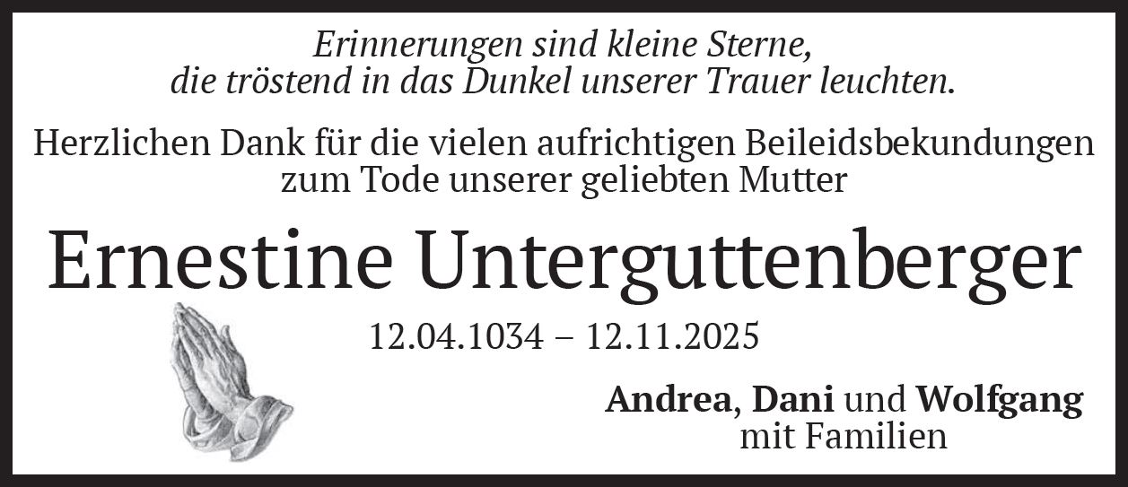 Wir trauern um Frau Ernestine Unterguttenberger geb. Kastner * 12.04.1934 † 12.11.2025 |