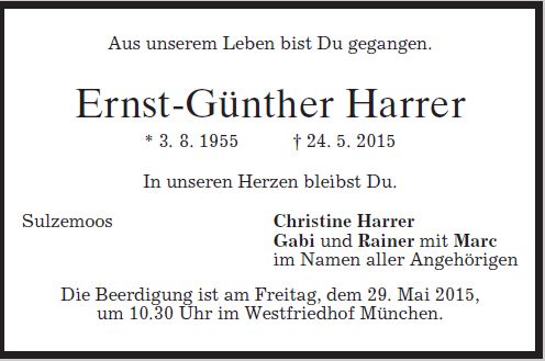 Die Beerdigung ist am Freitag, dem 29. Mai 2015, um 10:30 Uhr im Münchner Westfriedhof.
