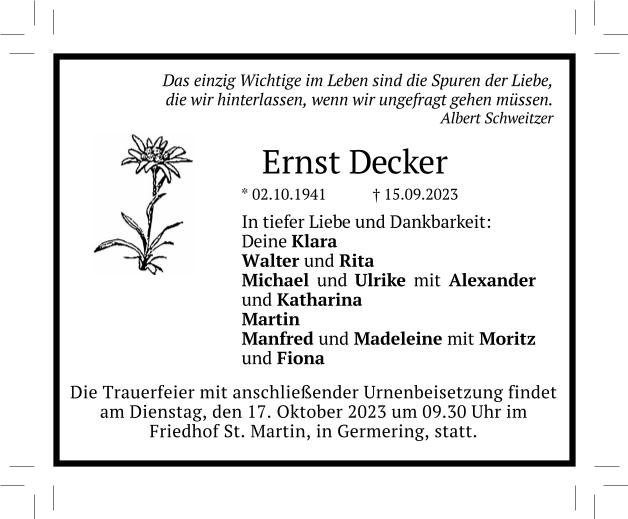 Wir trauern um Herrn Ernst Decker Angestellter im Vertrieb i. R. * 02.10.1941 † 15.09.2023 |