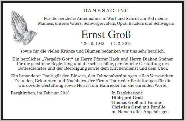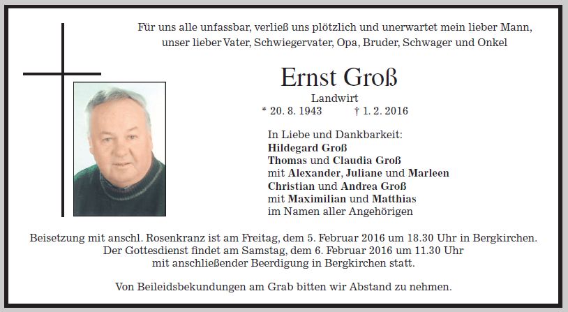 Gottesdienst am Samstag, dem 6. Februar 2016, um 11:30 Uhr in Bergkirchen mit anschließender Beerdigung.