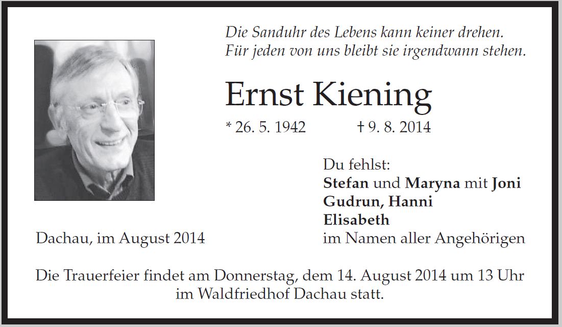 Trauerfeier am Donnerstag, dem 14. August 2014, um 13:00 Uhr im Dachau Waldfriedhof