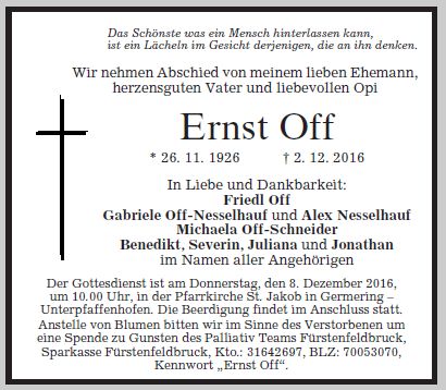 Der Gottesdienst ist am Donnerstag, den 8.12.2016 um 10 Uhr in der Pfarrkirche St. Jakob, Germering - Unterpfaffenhofen Die Beerdigung ist im Anschluß im Friedhof St. Jakob, Germering - Unterpfaffenhofen