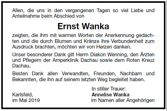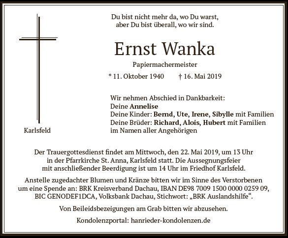 Der Trauergottesdienst findet am Mittwoch, den 22. Mai 2019, um 13 Uhr in der Pfarrkirche St. Anna, Karlsfeld statt. |