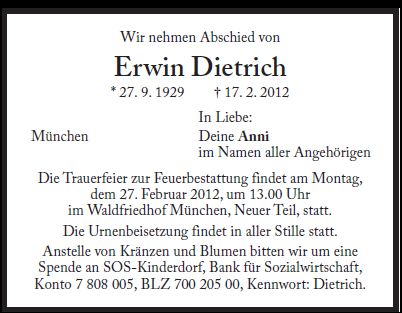 Trauerfeier zur Feuerbestattung am Montag, dem 27. Februar 2012, um 13:00 Uhr im Waldfriedhof München Neuer Teil