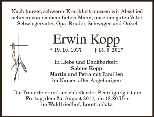 Wir trauern um Herrn Erwin Kopp Software-Entwickler * 19.10.1937 † 15.08.2017 |