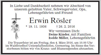 Die Trauerfeier zur Feuerbestattung ist am Freitag, den 4. März 2016 um 10 Uhr im Waldfriedhof Unterpfaffenhofen, Germering