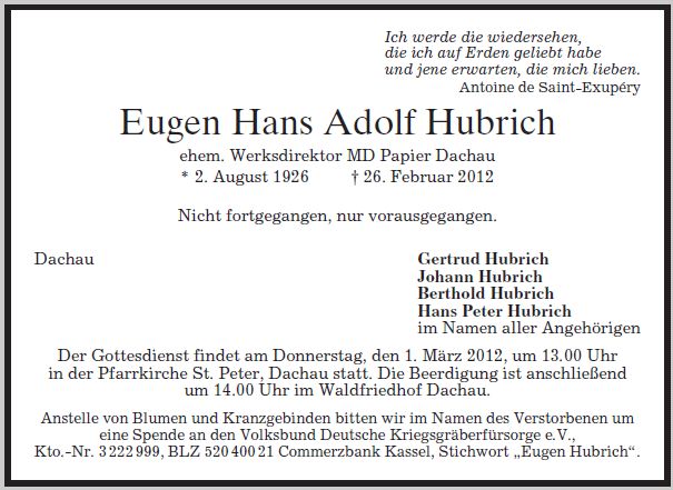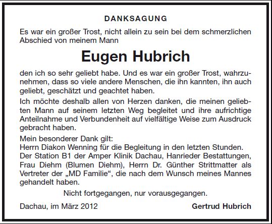 Gottesdienst am Donnerstag, den 1. März 2012, um 13:00 Uhr in St. Peter, Dachau. Beerdigung anschließend um 14:00 Uhr im Dachauer Waldfriedhof.
