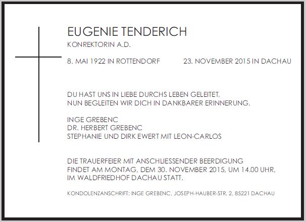 Die Trauerfeier mit anschließender Beerdigung ist am Montag, dem 30. November 2015, um 14 Uhr im Dachauer Waldfriedhof. |