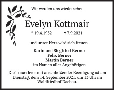 Die Trauerfeier mit anschließender Beerdigung ist am Dienstag, dem 14. September 2021, um 13:00 Uhr im Dachauer Waldfriedhof |