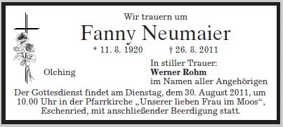 Gottesdienst am Dienstag, dem 30. August 2011, um 10:00 Uhr in Eschenried mit anschließender Beerdigung.