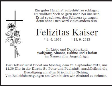 Gottesdienst am Montag, dem 23. September 2013, um 11:30 Uhr in St. Peter und Paul, anschließend die Beerdigung am Alten Friedhof in Olching. |